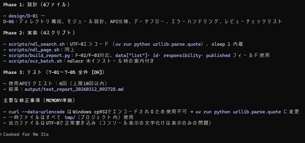 上記以外に調査精度の改善について壁打ち相手に聞いてみると、「NDC(日本十進分類)でのフィルタリング」・「ナレッジグラフ」・「再帰的フィードバックを用いた調査手法の動的更新」など提示してもらいました。この中ではおそらくNDCでのフィルタリングが一番簡単な気がします。