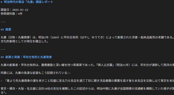 「大体あってる」ようなレポートを出してくれるようになったので、細かい事実関係などが気になってきました。こちらをどう詰めていくかというのも気になるのですが、似たようなジャンルを調べている際によく参照する文献があったり、「この文献にはこう書いてあるから……」ということが頭の中にあったりとなんとなくの勘所というかショートカットができることがあります。コンテキストメニューが消えたらこれまで調べた内容は消えてしまうはずなので、既に調べた内容を記憶しておく仕組みを作っておき、似たジャンルや内容の検索時に参照して精度を上げたりできればと思っていたりします。これはできれば今後やってみたいです。